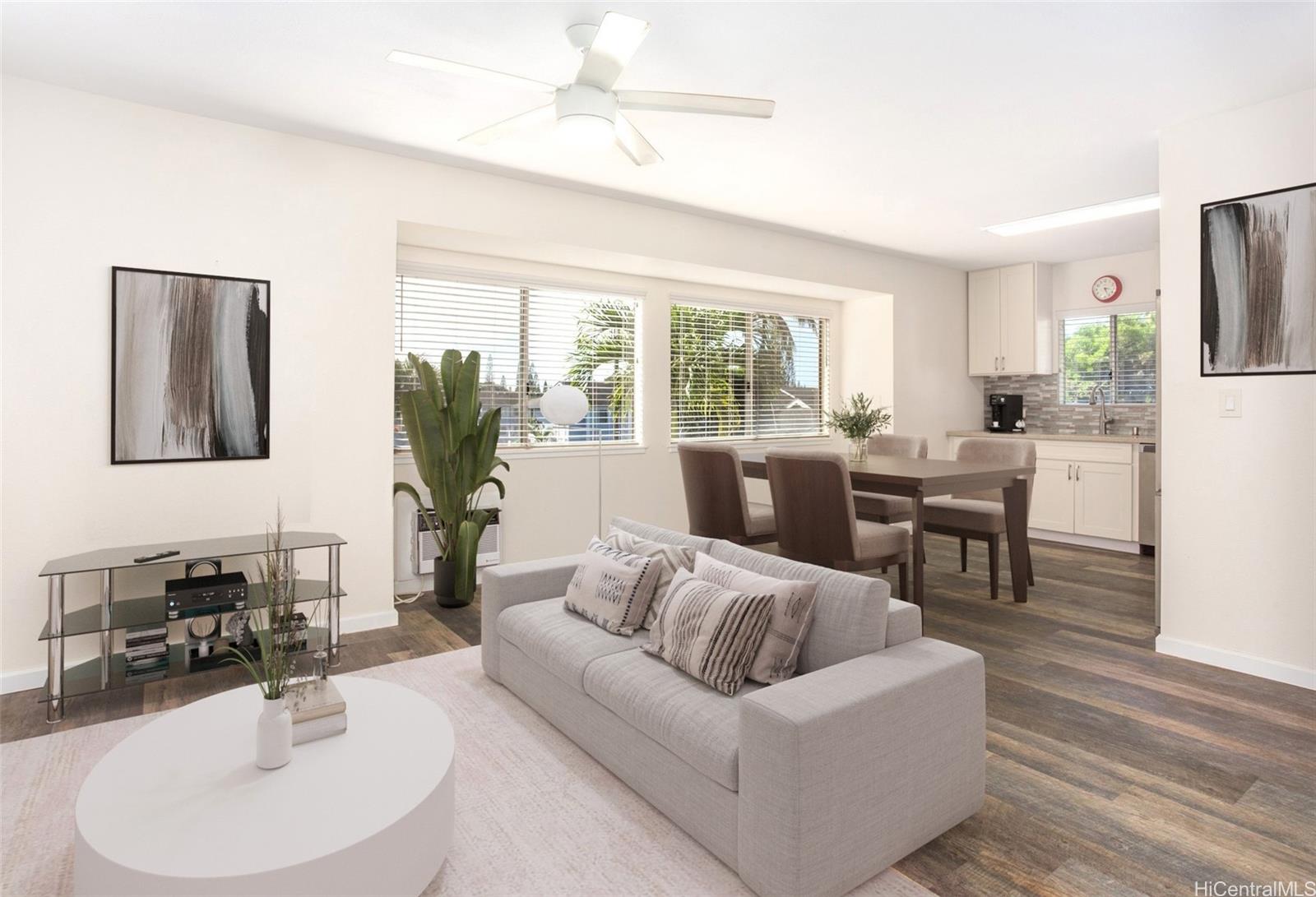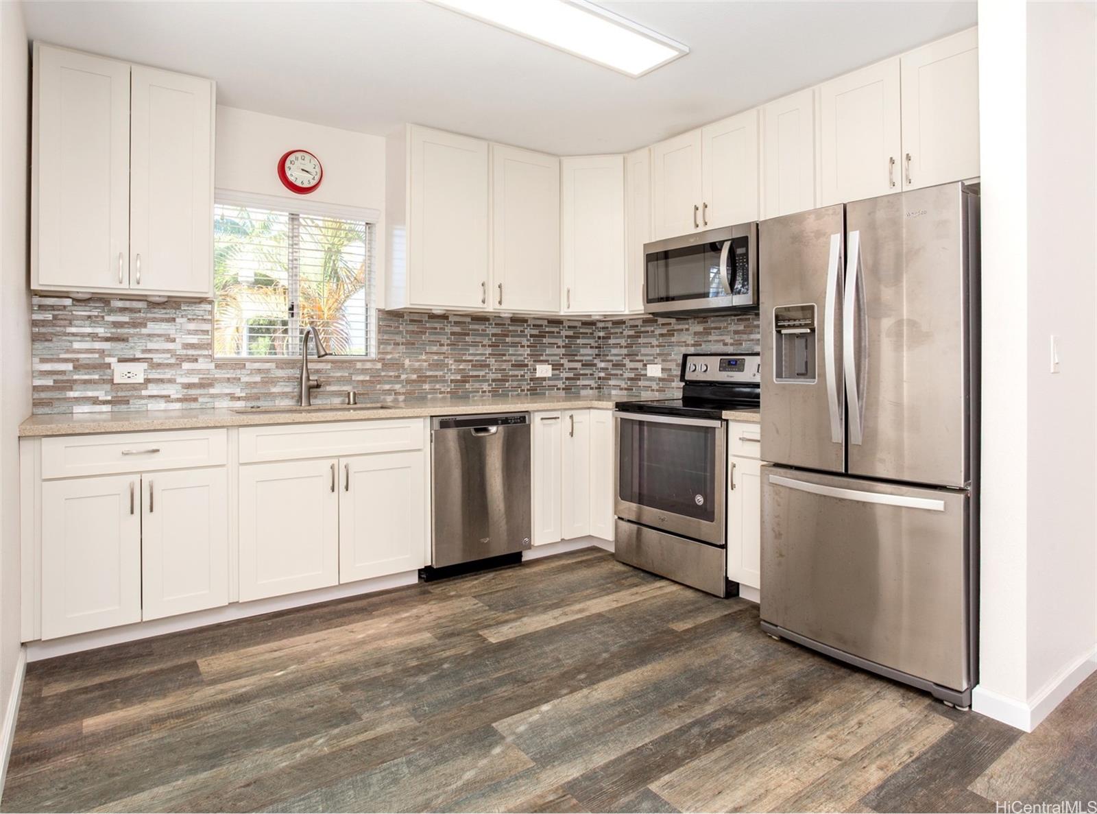 RARELY AVAILABLE!! Welcome to your Dream Home – This 2bed/1bath/2parking single-level townhome has been renovated and is located in desirable Mililani Mauka! This home features a designer kitchen, quartz counter tops, stainless steel appliances, AC, large under-mount kitchen sink, additional storage, open floorplan, luxury vinyl flooring, upgraded cabinets, ceiling fans, designer backsplash, full-size washer/dryer, cool breezes, & 2 assigned parking stalls. This home is conveniently located near the park, Mililani Town, Waipio, Waikele Shopping, Schofield Base, Costco, freeway access, many restaurants, schools, grocery stores, parks, bus stops & more.